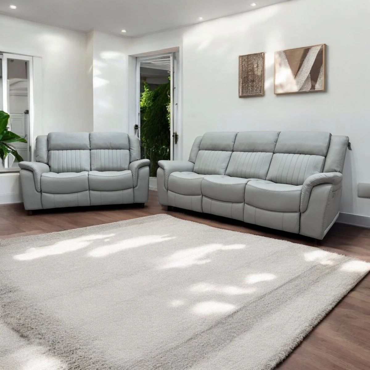 Introducing the Domino Power Reclining Sofa Set, designed for those who seek the perfect blend of luxury and functionality. Upholstered in soft, supple light grey leather with stylish stitched detailing, these sofas offer both comfort and support.